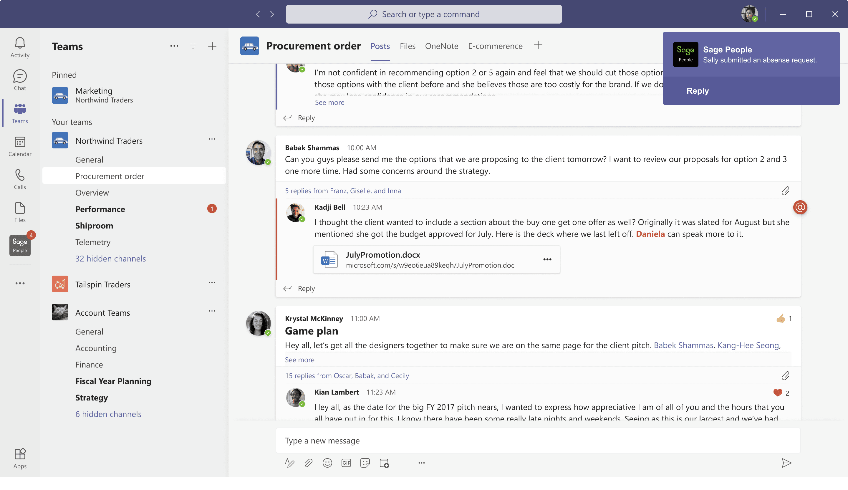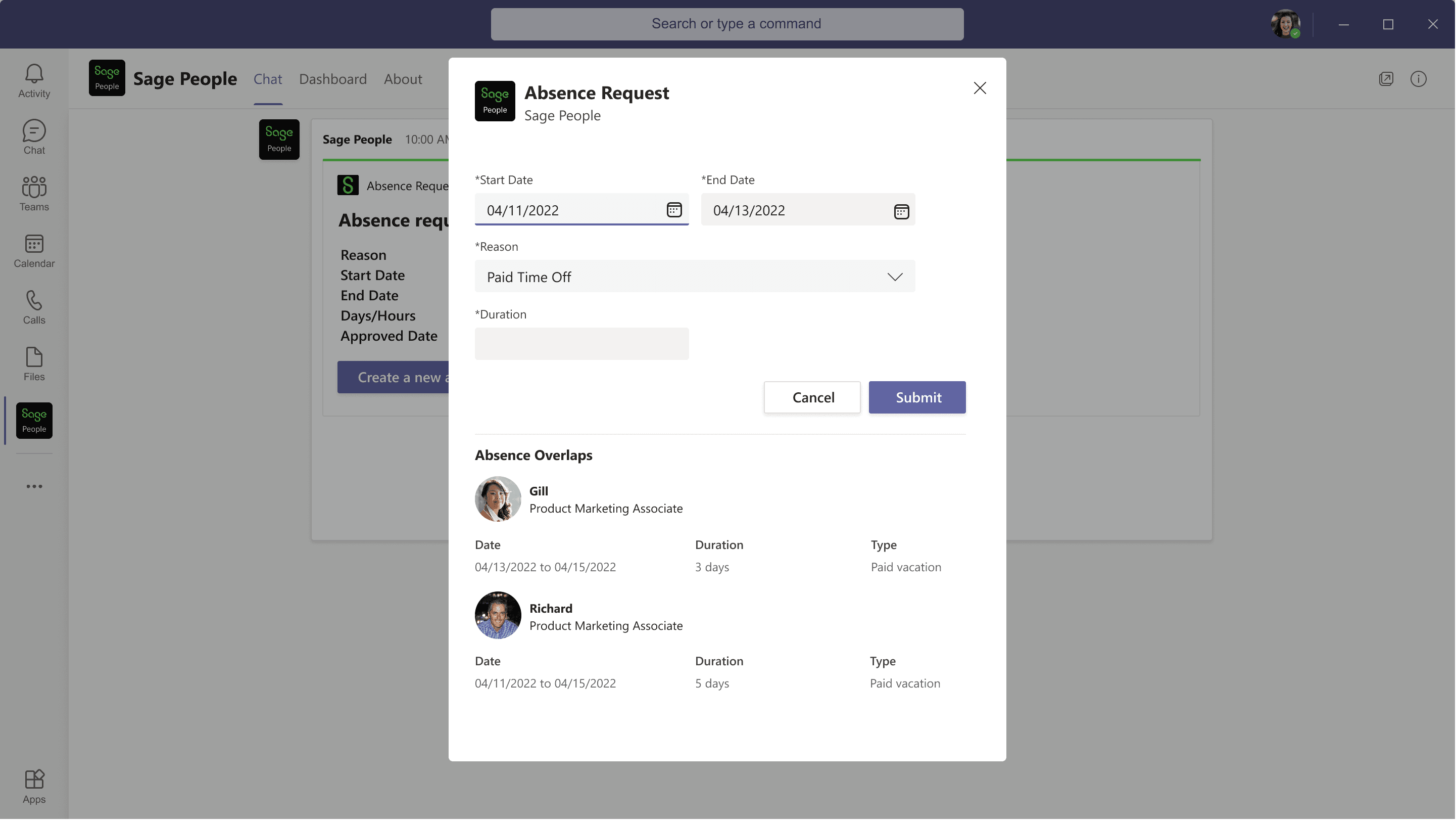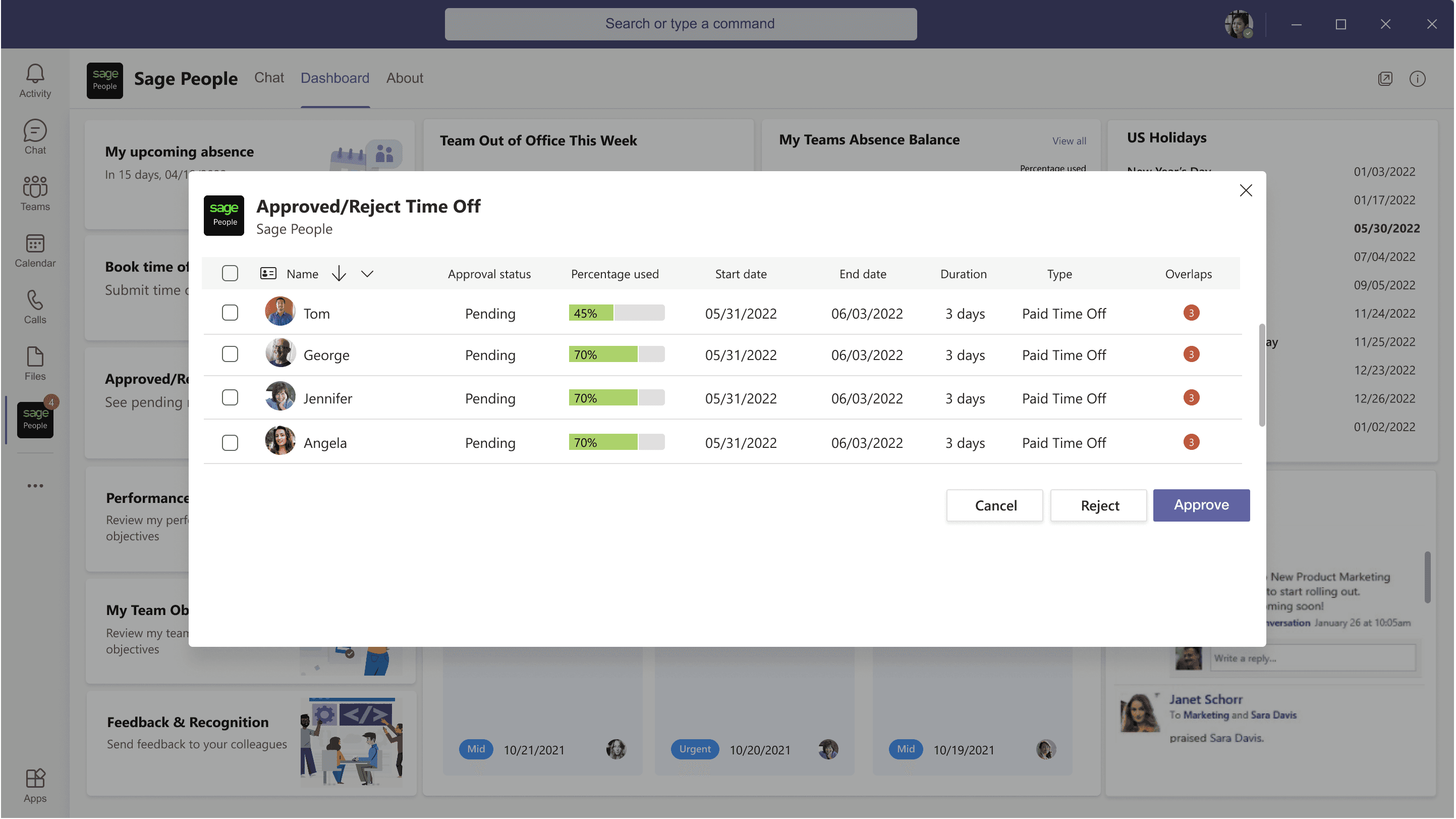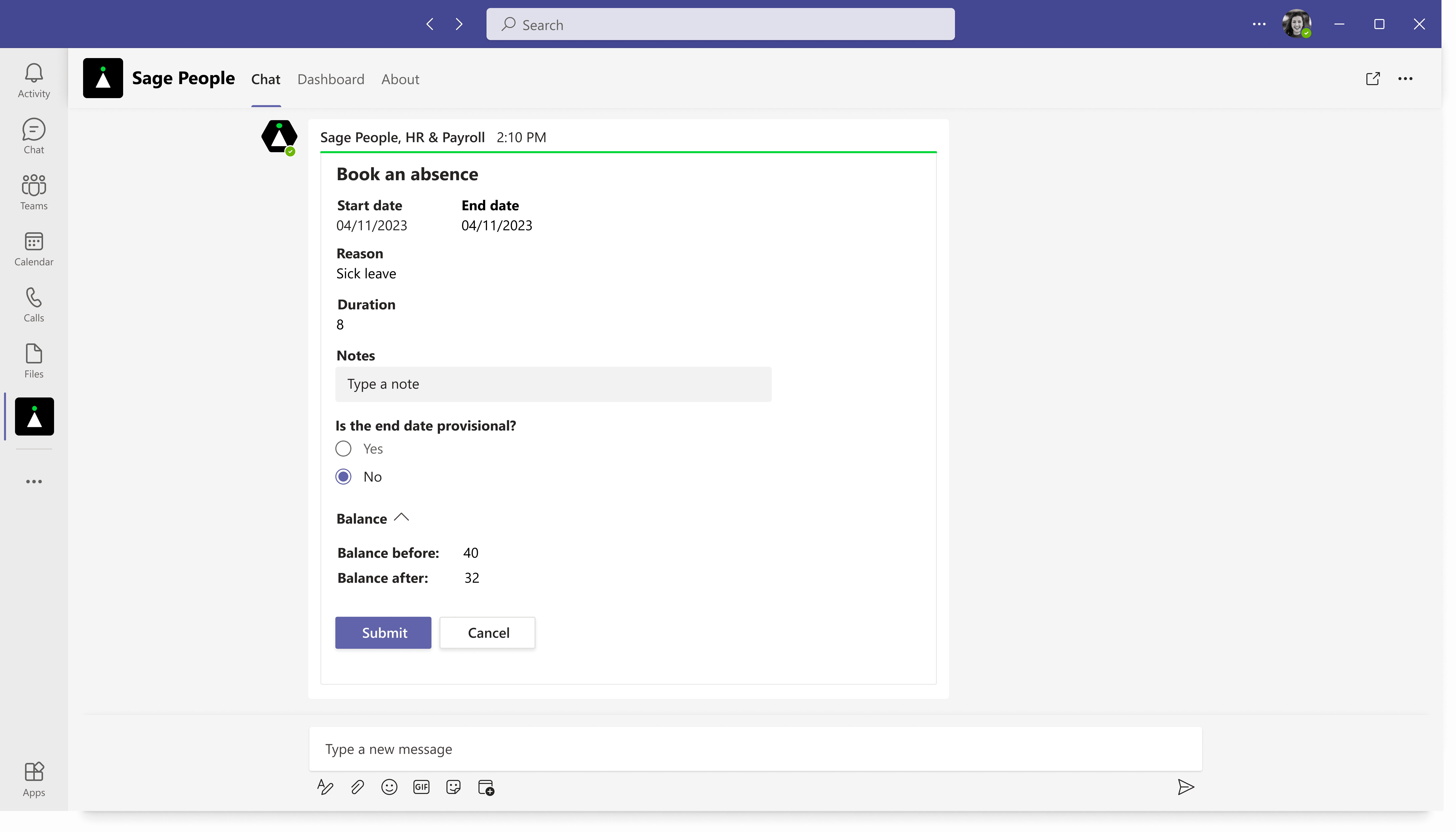 Employees can request time off through a conversational experience in Microsoft Teams, view leave balances, and receive instant notifications when requests are approved or declined. Managers can review and approve requests directly within Teams. They will not miss any time off request via emails, having to logins to Sage People , no follow-ups.